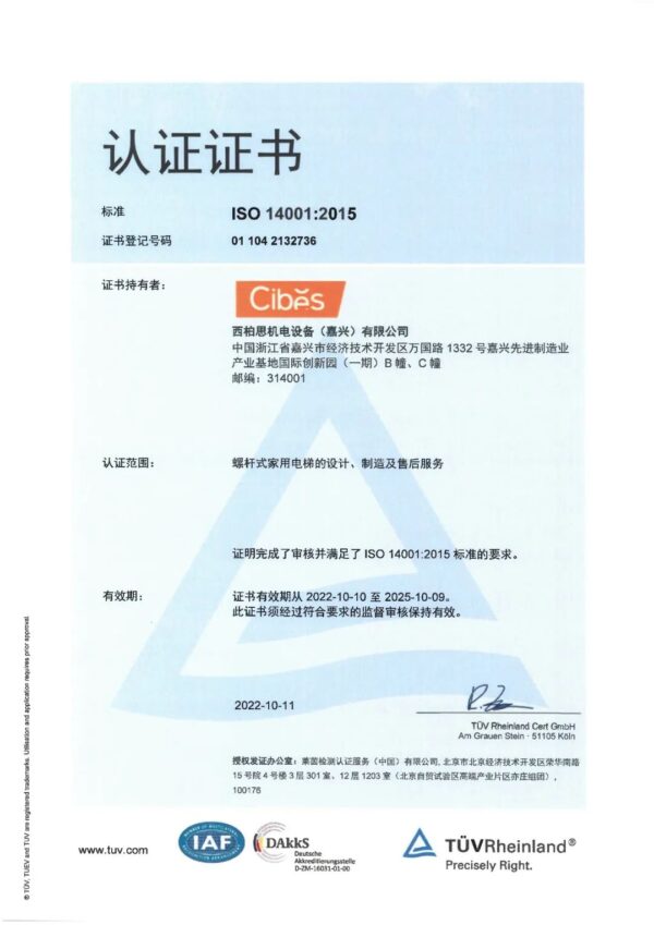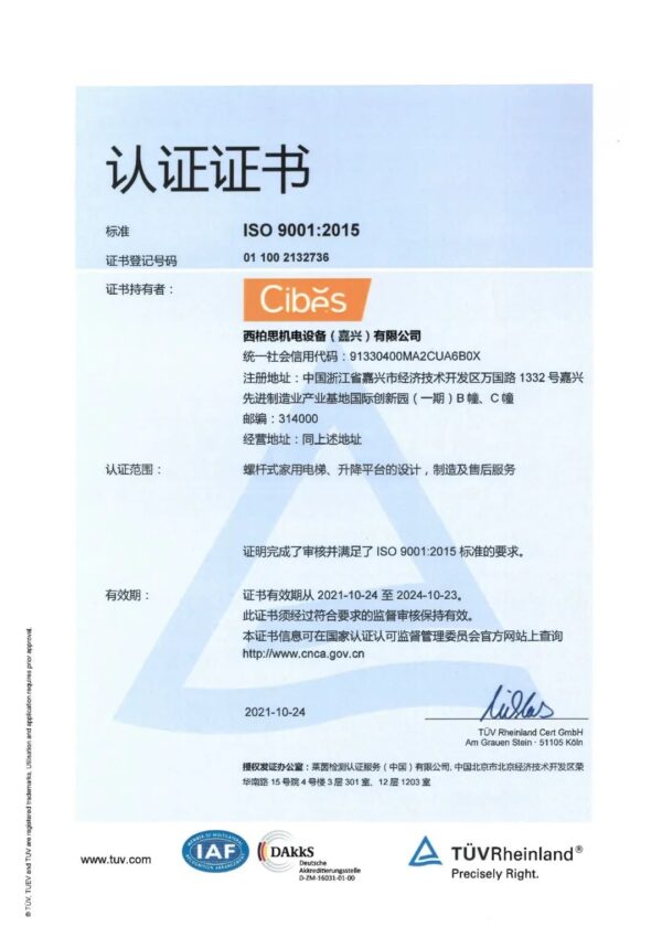 2021年,经过ISO认证机构——TUV的一系列指导和审核,确认集团亚太区工厂符合ISO质量管理体系标准,并颁发ISO 9001:2015质量管理体系认证证书,Cibes Lift Group西柏思电梯集团亚太区工厂开始全面推行ISO 9001:2005质量管理体系。